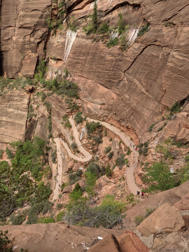 Today began with an early start – though we were held up waiting a bit longer than planned for the Springdale shuttle to the Zion entrance. Upon arriving to the entrance of the park, we spoke with the gear rental folks in hopes of getting boots and neoprene socks for the walk along the Narrows. The sky was a bit cloudy and there was still a flood watch in effect and their chart outfront indicated “probable” for a flashflood. While I was probably more interested in this watery adventure than Obi – we both agreed entering a narrow canyon with a flood watch would not be wise. So – instead we headed towards our back-up option, Angel’s Landing. Now, this hike it under the “strenouse” category and the description clearly warns people who are afraid of heights to avoid it. The hike consists of three phases (we decided to call each section of the hike a phases – this is not how it’s described by the park) of very extreme switch backs, given you are hiking a total elevation gain of 1500 feet, starting at 0. This is steep, so switch backs are necessary and they are truly in the shape of a tight Z. Phase 1: switch backs from base to a 1/3 way up. Transition phase, walking along the back end of the mountain on a relatively flat path – shaded. Phase 2: switchbacks to Scout’s Pavillion another 1/3 way up. Phase 3: “the chains” scaling up rock to the summit. Upon reaching a section called Scout’s Pavillion, you begin the final phase up a very narrow section of the mountain using chains to hold on as you scale up rock. Upon hearing about this hike, I naturally was intrigued immediately but knew Obi would not be interested. However, when learning that our water adventure was not possible Obi suggested again we try Angel’s Landing. I had my doubts but we loaded the Zion shuttle. On the shuttle we had some more time to think and I noticed another hike option called the Sand Bench trail. Given Obi’s disposition on narrow peaks I thought we might want to shift plans instead of attempting Angel’s Landing. The description of the Sand Bench trail was moderate (given the 4 mile length) and sandy. We spoke with the park ranger about it who said not much other than we might see some horse apples – meaning horse poop. When we reached the trailhead we immediately turned around realizing it is totally flat, in sand and peppered with horse “apples” – this is where the horse rides go. Yup – no thanks we said. I guess it was Angel’s Landing after all. This was one stop up the road so we loaded the shuttle again. We were well loaded on water and still had some food-coop snacks in my pack, a quick stop in the bathroom and off we ventured. I spoke with two folks you had just completed the hike – mind you this was at 9:30 am – they were on the first shuttle and began at 6:30 am. The total hike time is about 4 hours – but it seems most people finished closer to around 3.5 hours. The folks we talked to said it was steep on the switchbacks but thrilling. I was ready – but the anecdotes from finishers left us both feeling more confident and ready to go. Off we went – up, and up and up. I set a steady pace trying to moderate my speed so that Obi and I were close. The sun had been hiding behind some clouds all morning, but as we began up, she shone in all her glory. I loaded up some sunscreen but the sweat came on fast. As I mentioned earlier – this was a steep incline in a short distance so you are huffing it north. We eventually caught up with a mom and daughter who set a pace for me – which in turn was a good pace for Obi. We shared some nice chit chat as we ascended. Our plan was to reach Scout’s Pavillion and see what the final phase actually looked like – then decide about going onward or turning back. The mother and daughter had a similar plan and so when the four of us completed the switch backs and took in the view of the pavillion – everyone decided to complete the final phase. We made a pact so support each other. We started at the first chain section (which we learned later on is the most scary given the slope of the mountain) – no sooner did we begin did the mom decide that she was not going forward. She quickly stopped and wanted to turn around so they waved goodbye and sent us along. Obi and I made it through the first chain section – but it was challenging. The chains are like a one way street – so if folks are coming down you have to wait until they pass. Waiting on a typical hiking trail is fine -you casually step aside and wait for the folks coming down to pass (down always has the right of way on an incline). Given the nature of this section, you are essentially crawling on rocks and holding chains – folks coming down are not that speedy (going down is also always more difficult than going up). My favorite mountaineering expression is, “Going up a mountain is optional, coming down is mandatory.” Waiting for people to pass while your adrenaline is going and the anticipation of what is to come is challenging and I started to feel a bit impatient – also starting to worry about Obi given I knew he was very far from his comfort level. After some stop and go action we passed through the tough part to the final plateau before the last ascent which would probably be another 25-30 minutes. According to my watch there were about 700 feet left to climb. It was at this point looking ahead at what is to come did Obi start to vocalize his doubts even more. Despite this, he made the heroic choice to push on – but, the start of this section has a small drop and it was at this moment Obi said “No.” He was done – his nerves were shot. It was clear we would abandon the plan and instead make out way back to the Pavillion and reassess our next step. Before heading back down though we took some pictures of the view we had. Angel’s Landing is a high point in the middle of the valley/canon and so you can see quite far with wild and free mounta